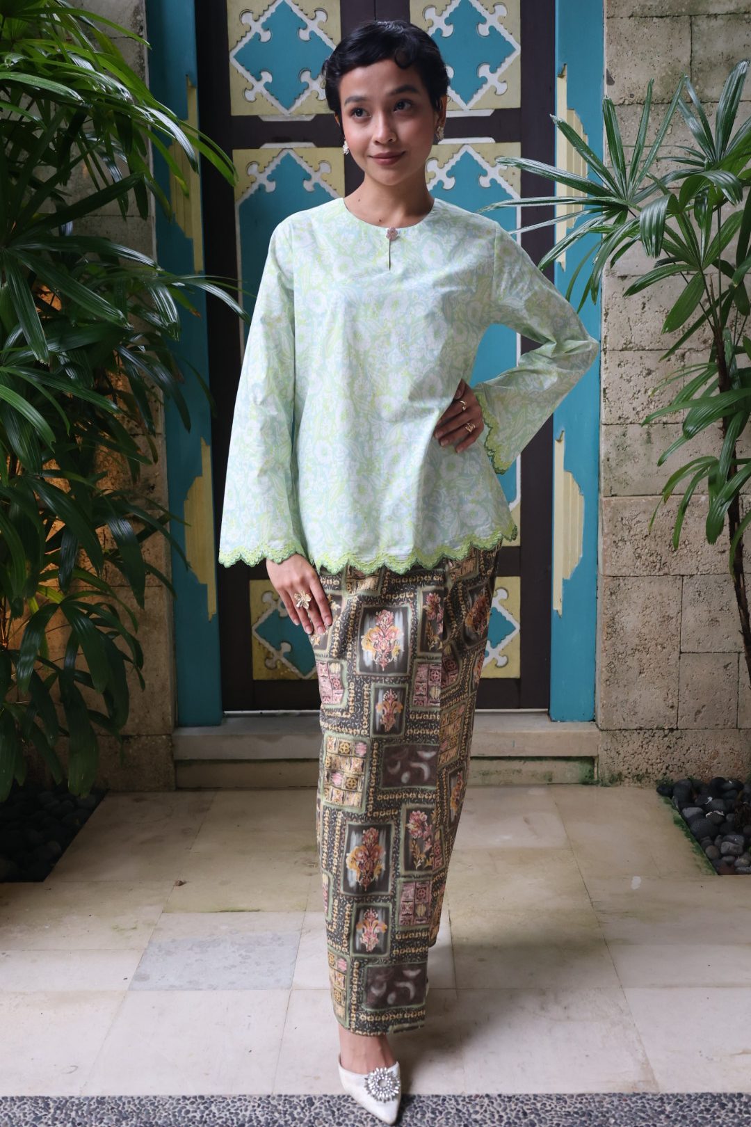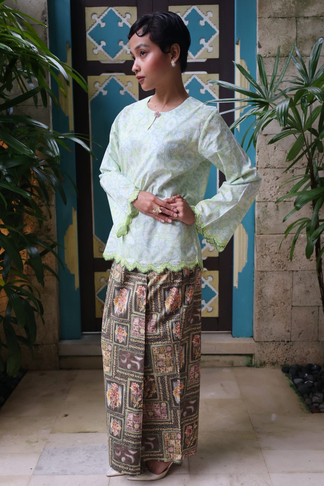 - Traditional front pleat (batik-style fold)