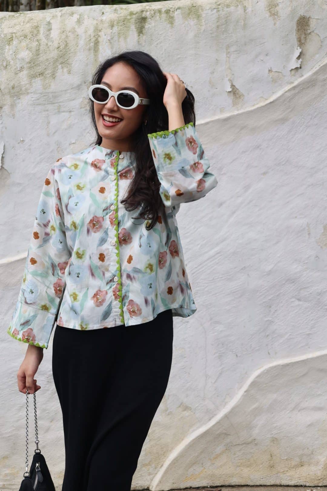- Printed top with delicate shell stitches